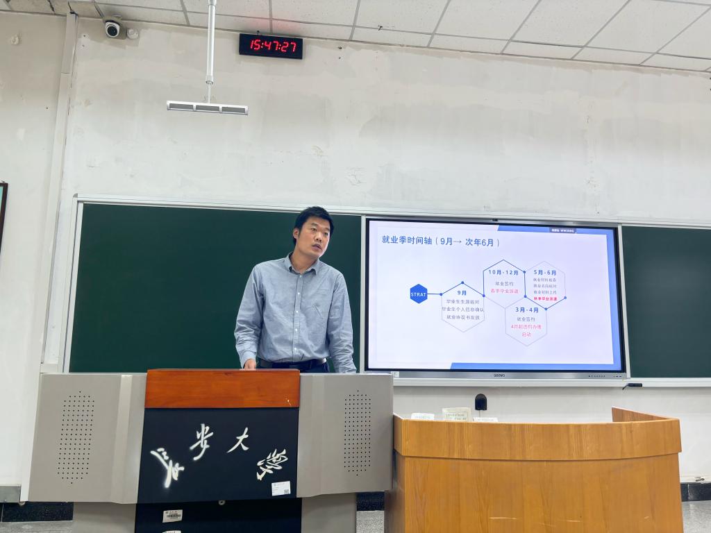 在南校区举行2025届毕业生就业指导会。学院党委副书记高婷婷,研究生辅导员王博、陈凡,2025届全体研究生毕业生参加。会议由辅导员刘平利主持。