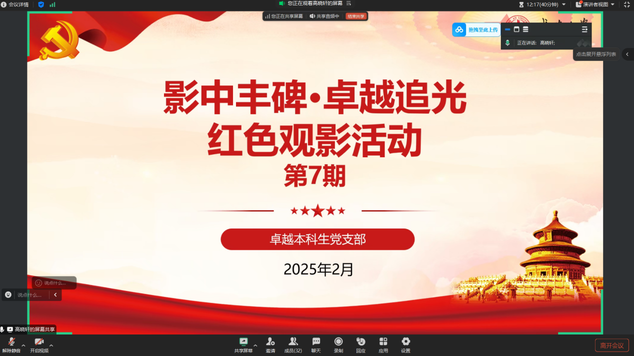 卓越本科生党支部举行了第七期“影中丰碑·卓越追光”红色观影活动。此次活动的主题聚焦“最美奋斗者”焦裕禄,全体支部成员共同参与,通过光影艺术重温“人民好书记”焦裕禄的感人事迹,在沉浸式学习中感悟共产党人的初心使命,激发干事创业的责任担当。