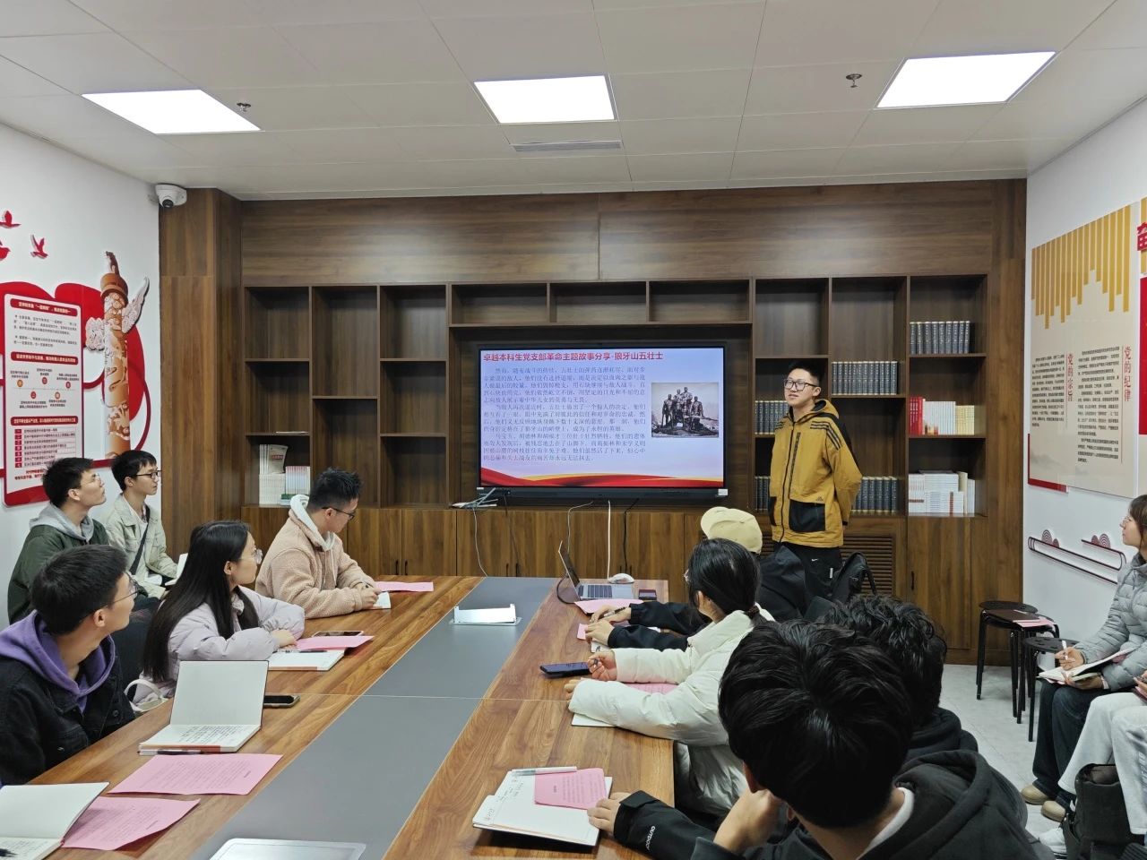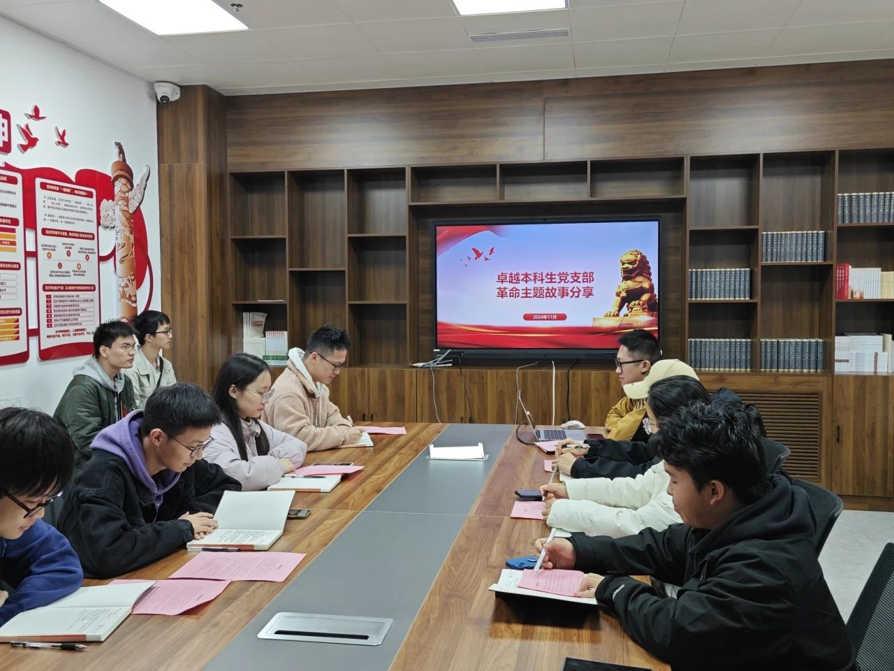 卓越本科生党支部于学院327会议室开展“烽火印记 卓越传承”革命主题故事分享活动,党支部书记张馨月、党支部副书记刘平利及全体党员参会。