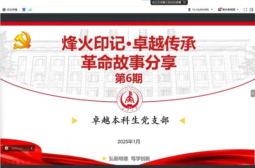 卓越本科生党支部在线上成功举办了“烽火印记,卓越传承”革命故事分享会(第6期)。本次分享会吸引了卓越党支部全体师生的热情参与,大家共同回顾了十大元帅之一朱德同志的烽火历程,深刻体会了他在艰苦岁月中不畏牺牲、勇往直前的崇高精神。