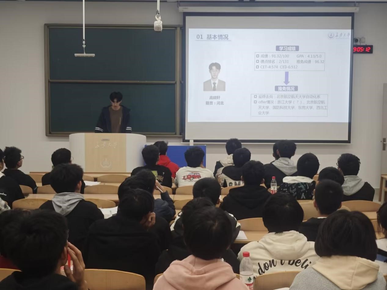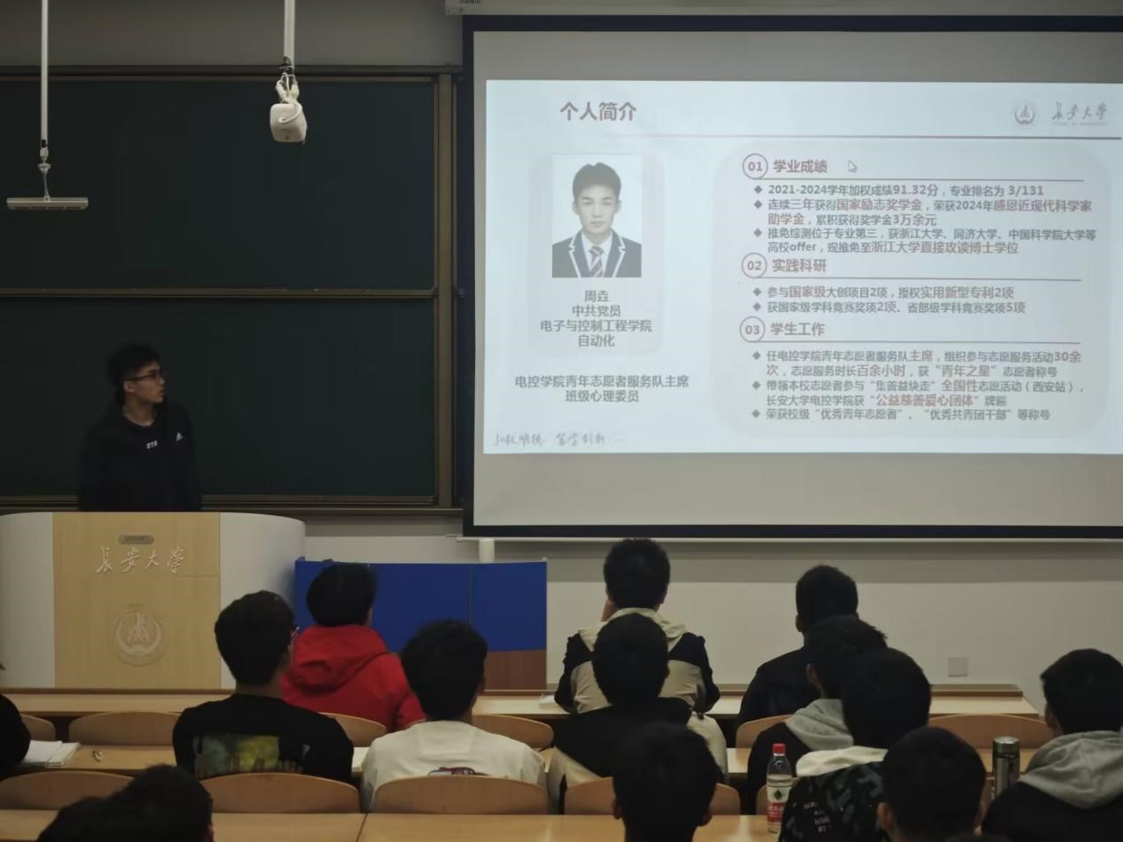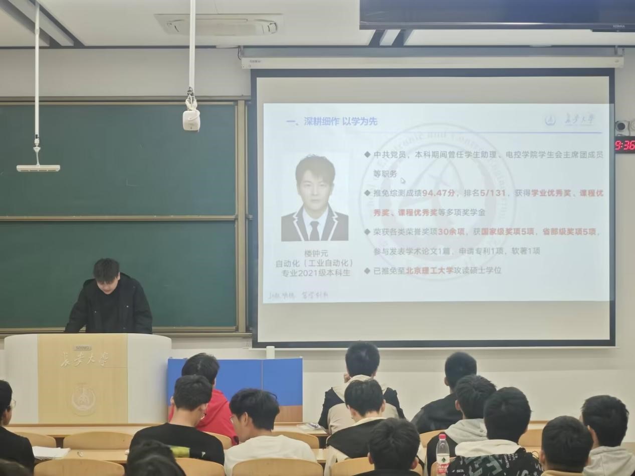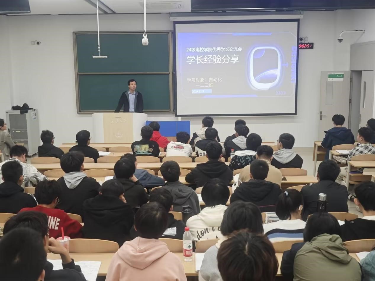 ““优秀学长经验交流会”于11月7日晚上19点在WH1101教室召开,会议邀请2021级保研学生高晓轩、楼钟元、周垚作经验分享,2024320101班班主任周经美,2024320101、2024320102、2024320103班全体同学参加会议,会议由自动化系副主任杨盼盼主持。