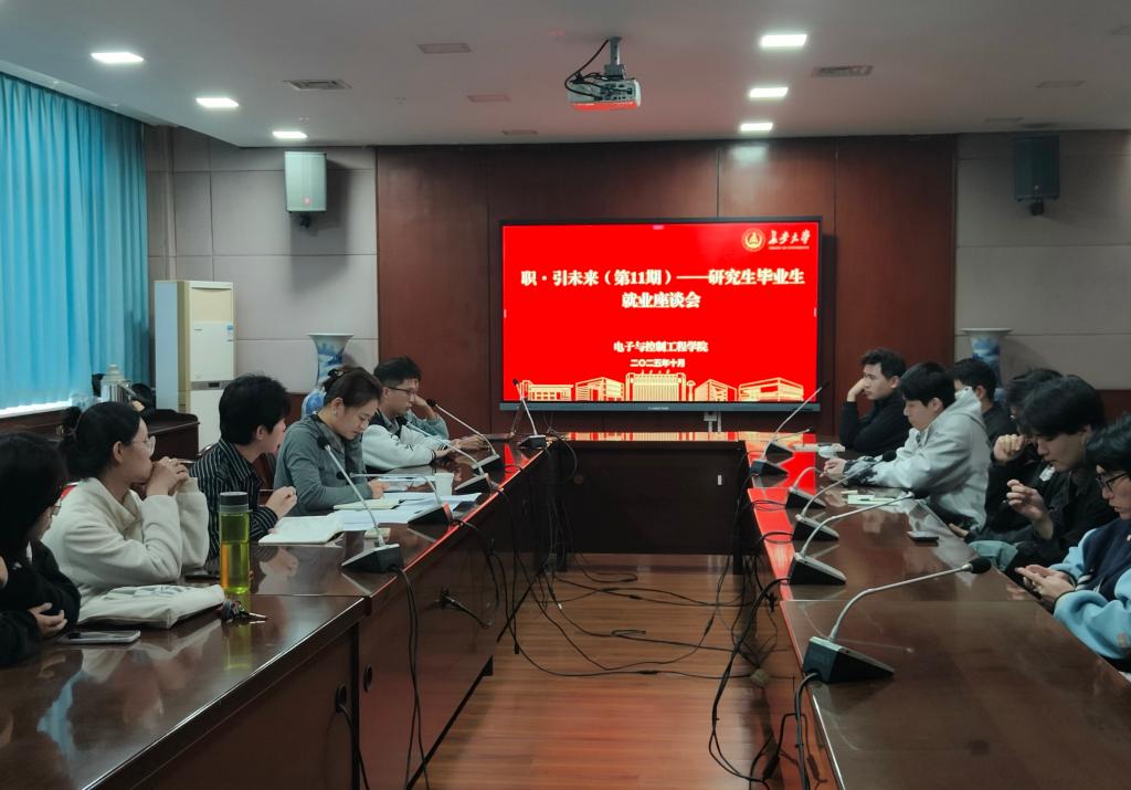 在南校区学术交流中心第五会议室开展职·引未来(第11期)——研究生毕业生就业座谈会,学院党委副书记高婷婷、研究生辅导员王佩佩、贾敏及毕业生代表参加会议。