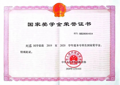 在专业学习上,在前三学年共有46门课程取得了90+的成绩,获9项“课程优秀奖”,并且连续三年获得了“优秀学业奖”,最终刘露同学以推免综合测评专业排名第二的成绩获得学校保送研究生资格。此外,刘露同学通过全国计算机二级C语言程序考试、普通话水平测试等并获得相应证书。端正的学习态度,严谨的学习风格,不仅为刘露同学带来了优异的成绩,也塑造了她踏实、稳重的性格。