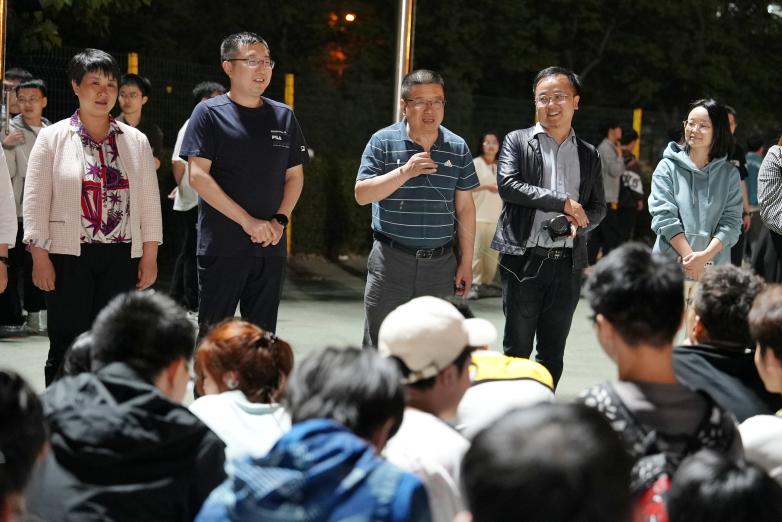 4月17日晚,污污漫画 院长闫茂德、院党委副书记李阳来到北校区朝晖体育场慰问学院备战校运动会的全体辅导员、运动员和工作人员。