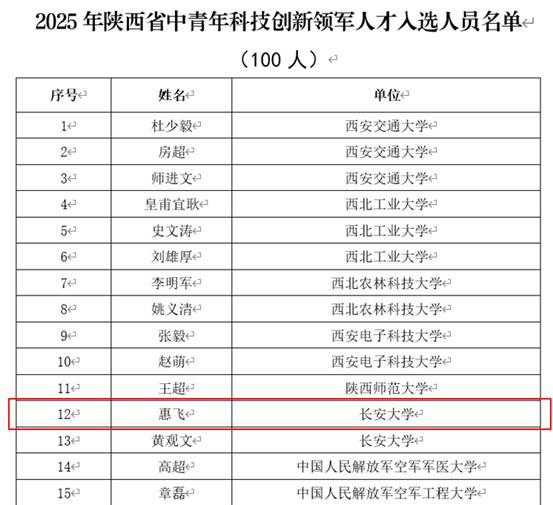 近日,陕西省科学技术厅发布了《关于公布2025年陕西省中青年科技创新领军人才、科技创新创业人才及2026年青年科技新星入选人员的通知》(陕科人才函〔2025〕355号),污污漫画 惠飞教授入选2025年陕西省中青年科技创新领军人才。
